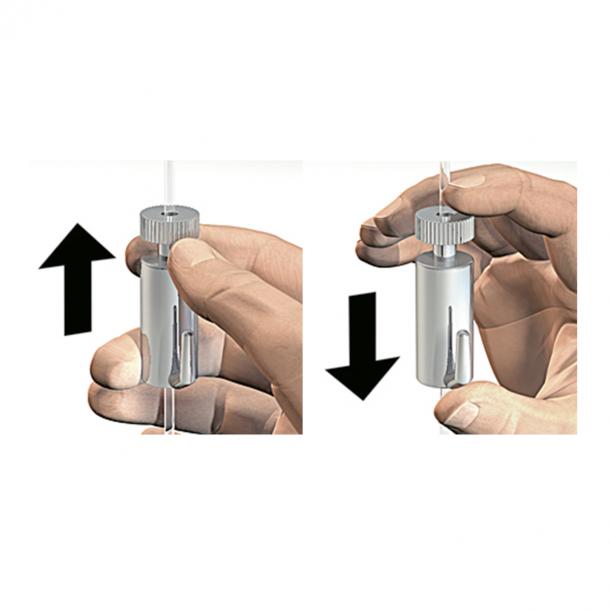 Deze ophanghaak heeft een zelfklemmende bediening door het mechanisme in de haak. Dit mechanisme zorgt voor het correct (automatisch) vastklemmen van de haak op de draad. Door de bedieningsknop in te drukken kan de ophangdraad in de haak worden aangebracht en is de haak flexibel in hoogte te verstellen. De maximale draagkracht van de haak is 15 kg.