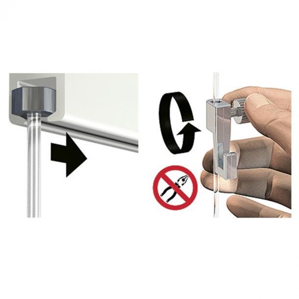 Deze ophanghaak heeft een manuele bediening. Door het schroefje los te draaien kan de ophangdraad in de haak geschoven worden. Op de gewenste plek kan de haak vastgezet worden op de draad door het schroefje vast te draaien. De maximale draagkracht van de haak is 4 kg.