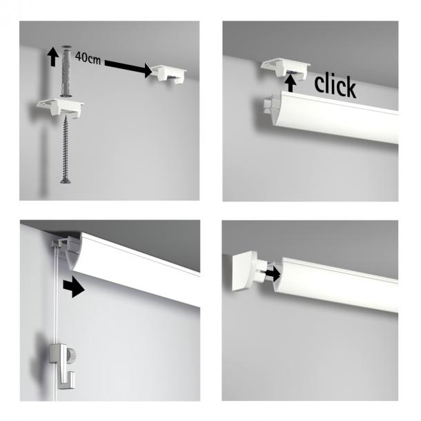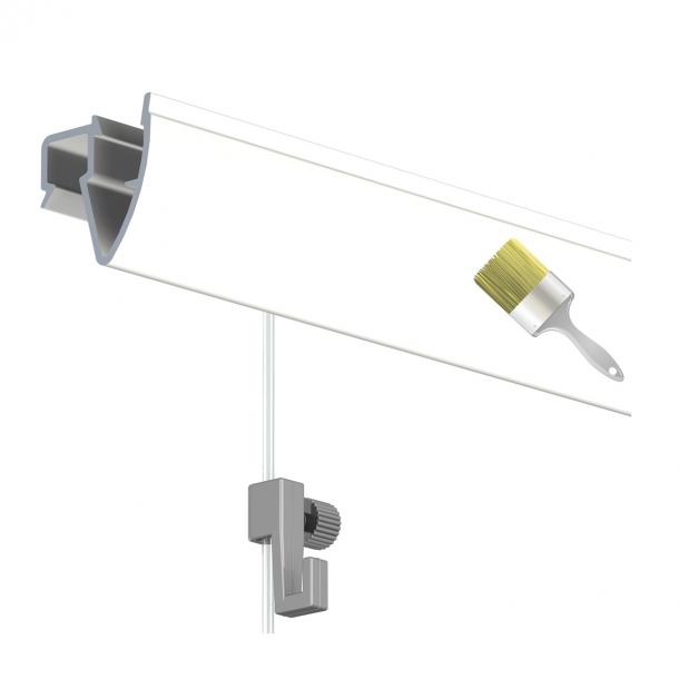- Productbeschrijving Is een wandmontage niet mogelijk dan kan het schilderij ophangsysteem Up Rail de oplossing bieden. Dit schilderij ophangsysteem is direct te bevestigen tegen betonnen plafonds. De installatie is snel en eenvoudig uit te voeren door het gebruik van clips. De Up Rail wordt stevig in de clips geklikt en biedt zodoende een veilige en flexibele manier voor het ophangen van decoraties aan de wand. De mooie, ronde vorm van de rail vult de ruimte tussen wand en plafond perfect. De complete all-in set Up Rail 2m bevat 200 cm Up Rail, 2 ophangdraden met haak 4kg en al het bevestigingsmateriaal. De RAL-kleur van deze witte rail is 9016. De rail is een primer versie, wat betekent dat de rail ook in elke gewenste kleur geschilderd kan worden.