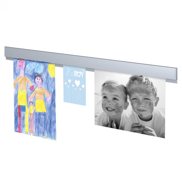 - Product description The Info Rail can be used to hang drawings, cards, photos and other documents. And this can be done in a tidy and flexible way without damaging the walls! The rail only has to be mounted to the wall once and is attached firmly to the wall using clips. The rubber clamping mechanism in the rail allows drawings and other documents to easily be hung on the rail. The display can be changed in just a few seconds: it is therefore always flexible! A useful and original addition to the wall. This rail has an aluminium finish.